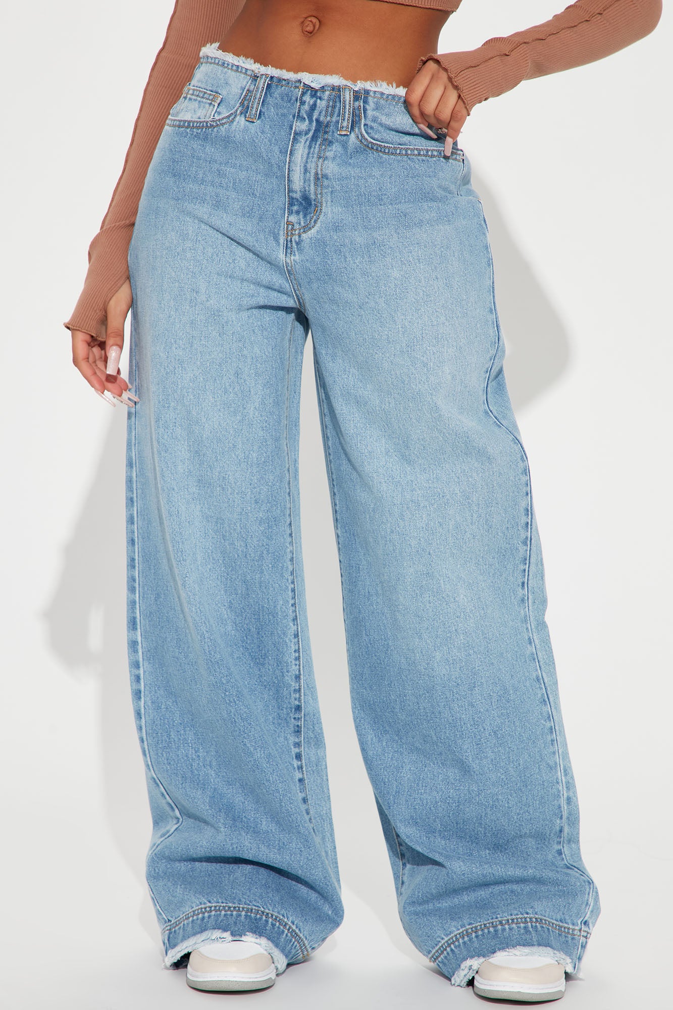 In Your Dreams Cut Off Waistband Baggy Jean - Medium Wash
