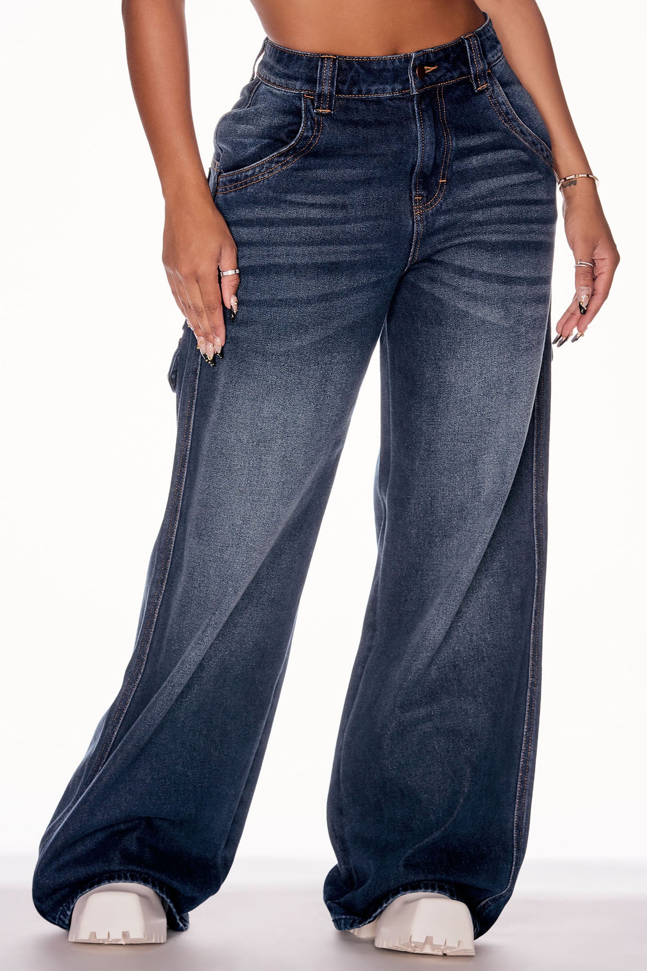 Carly Cut Off Waistband Cargo Jeans - Medium Wash