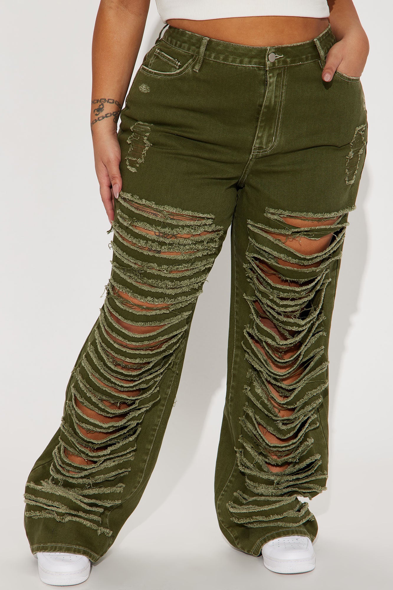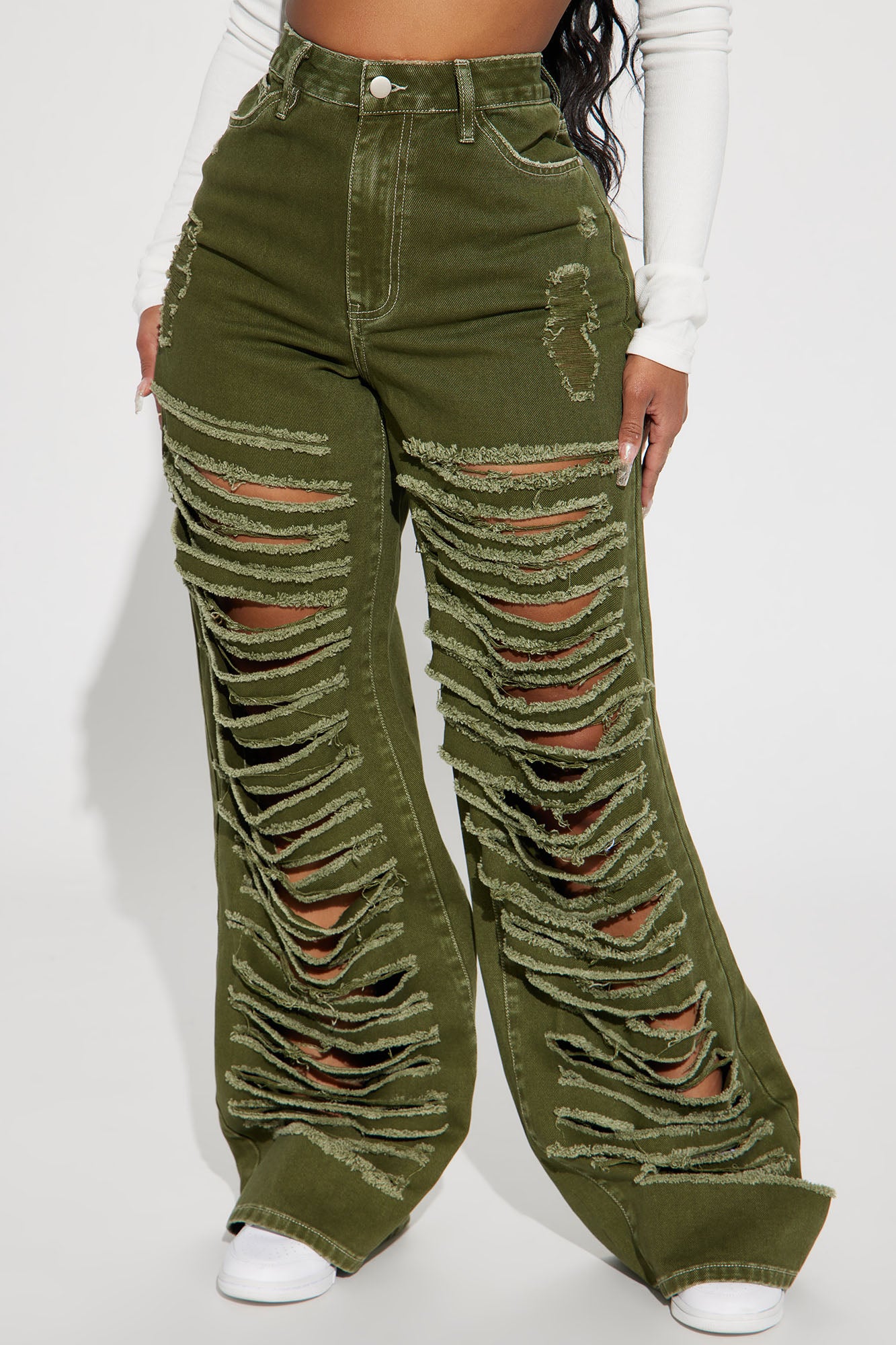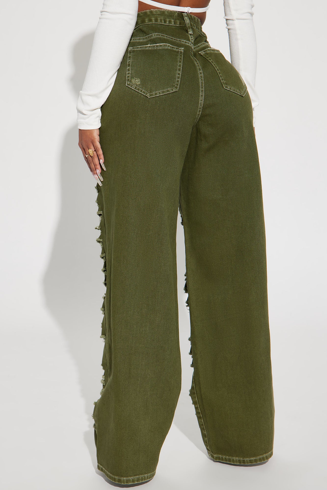 • Big Dreams Non Stretch Ripped Wide Leg Baggy Jean - Olive
