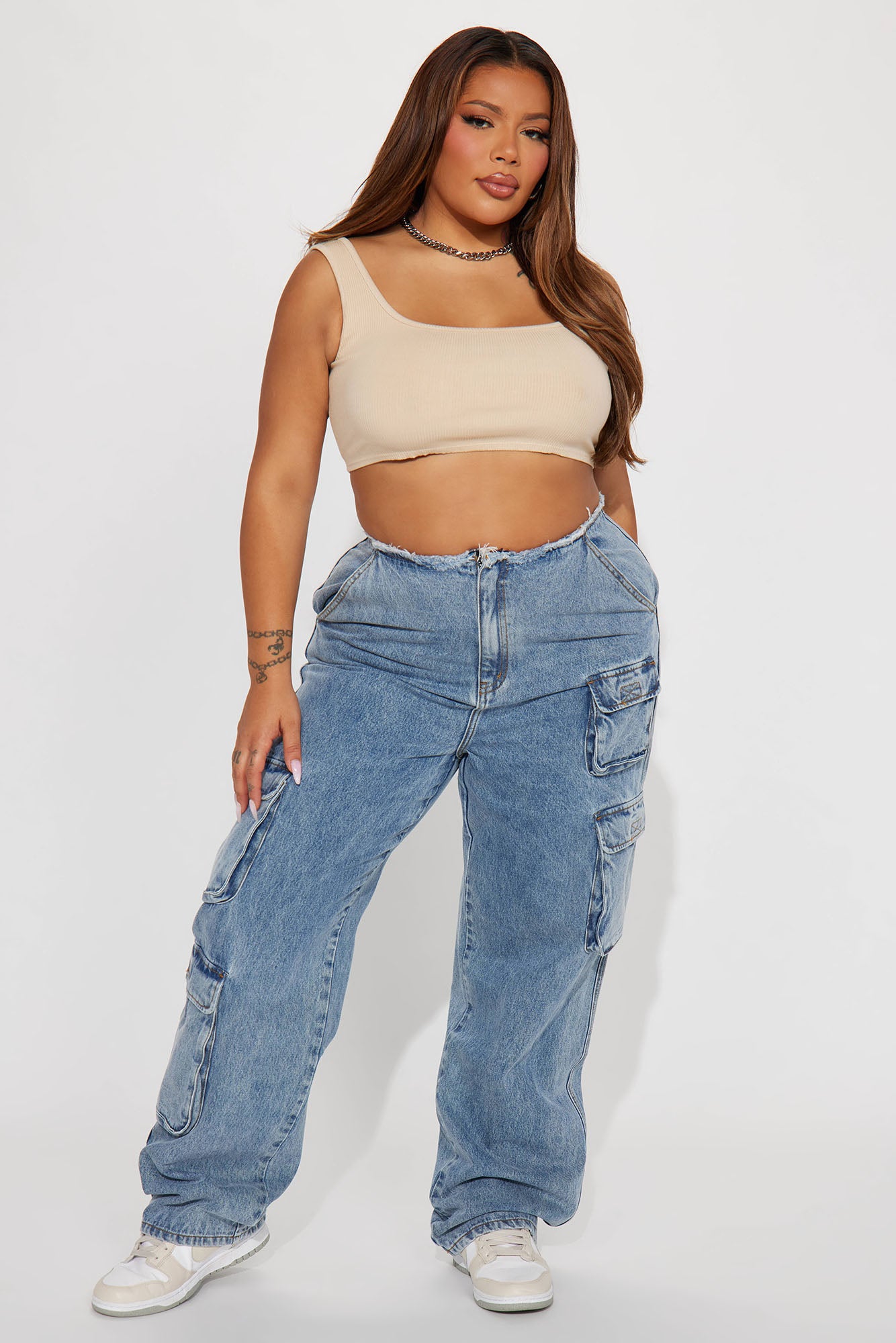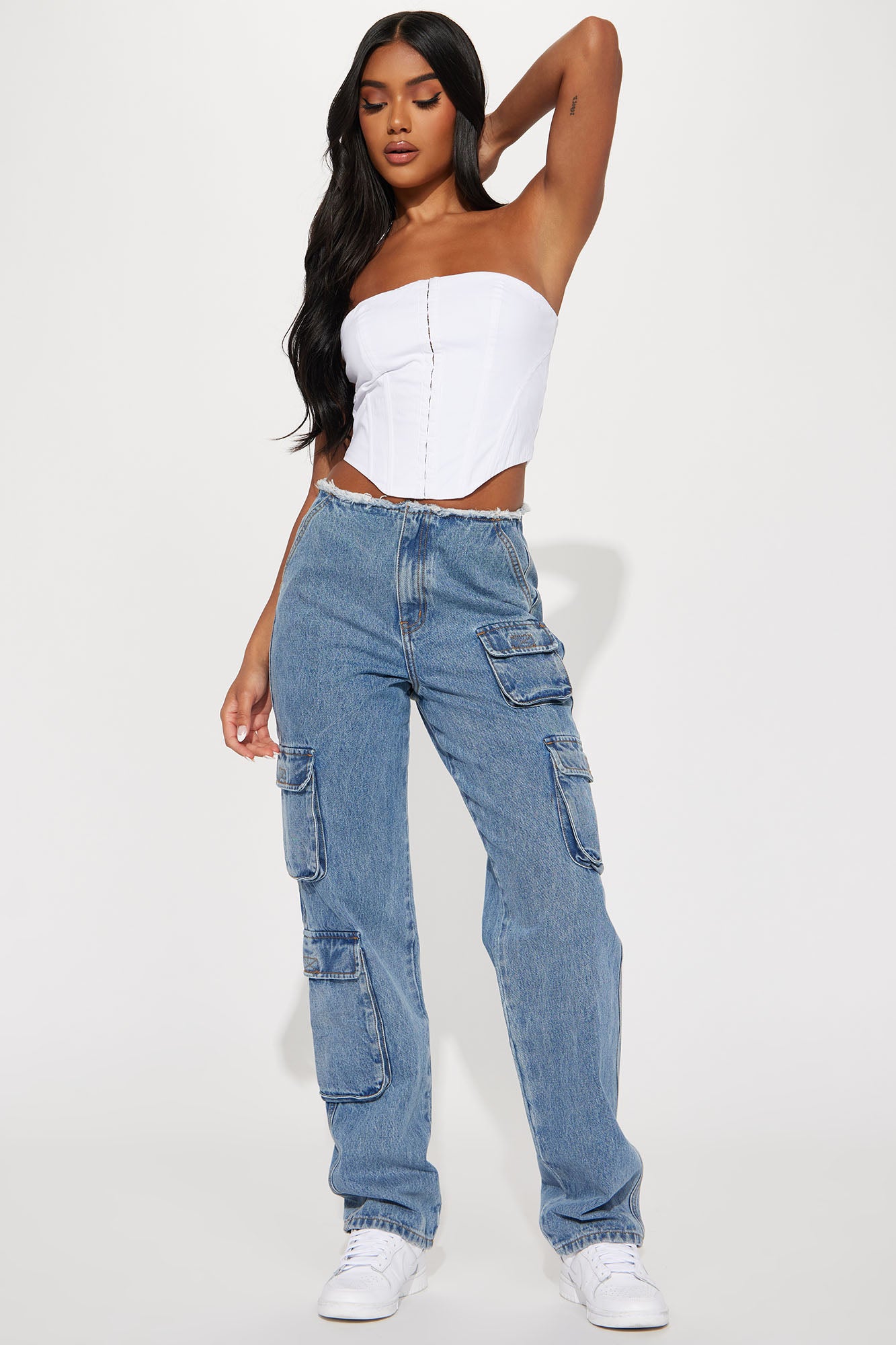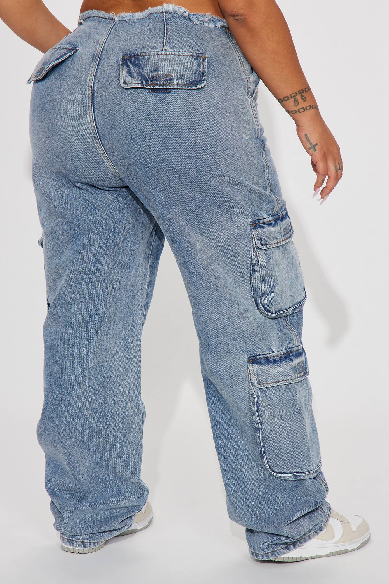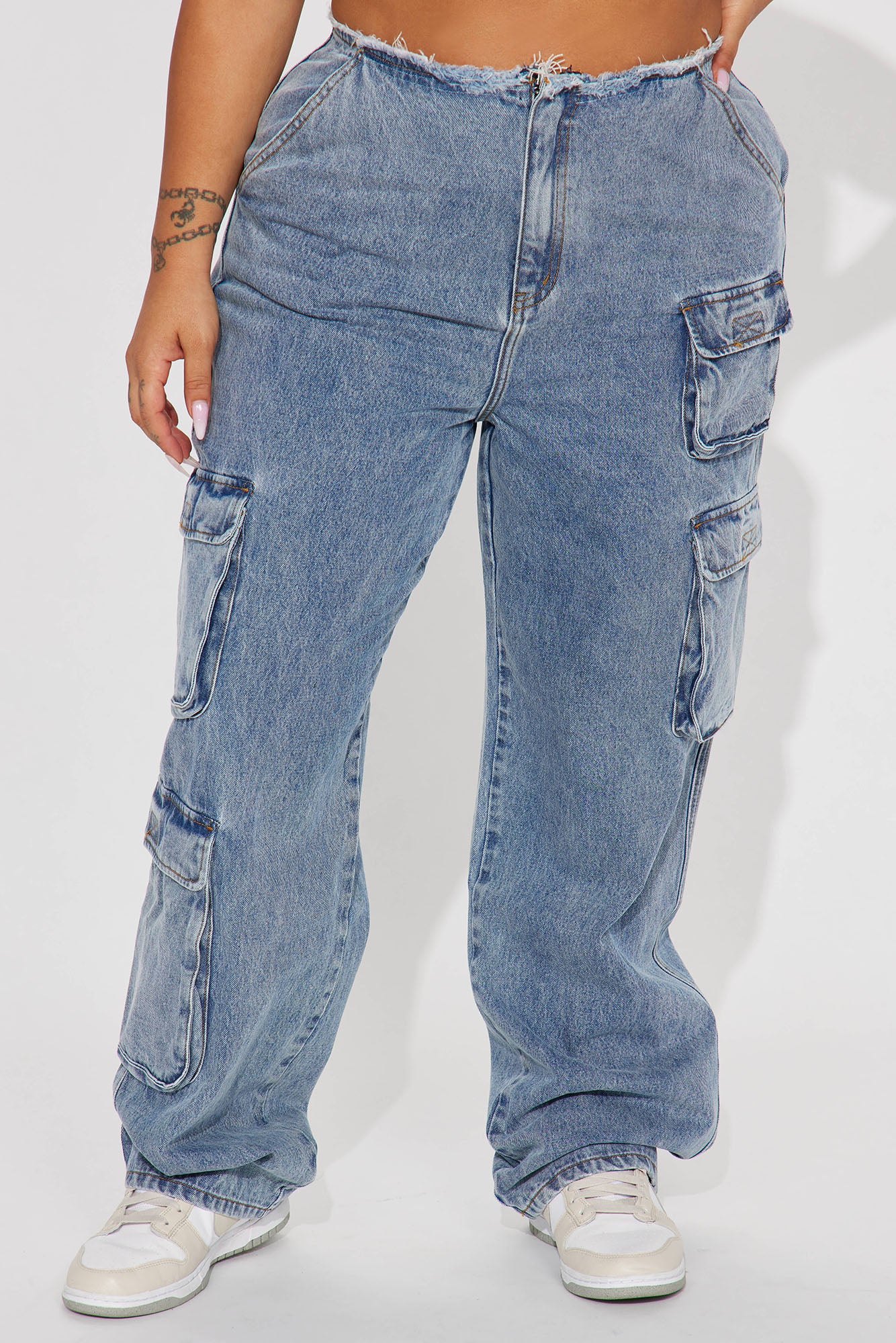 Carly Cut Off Waistband Cargo Jeans - Medium Wash
