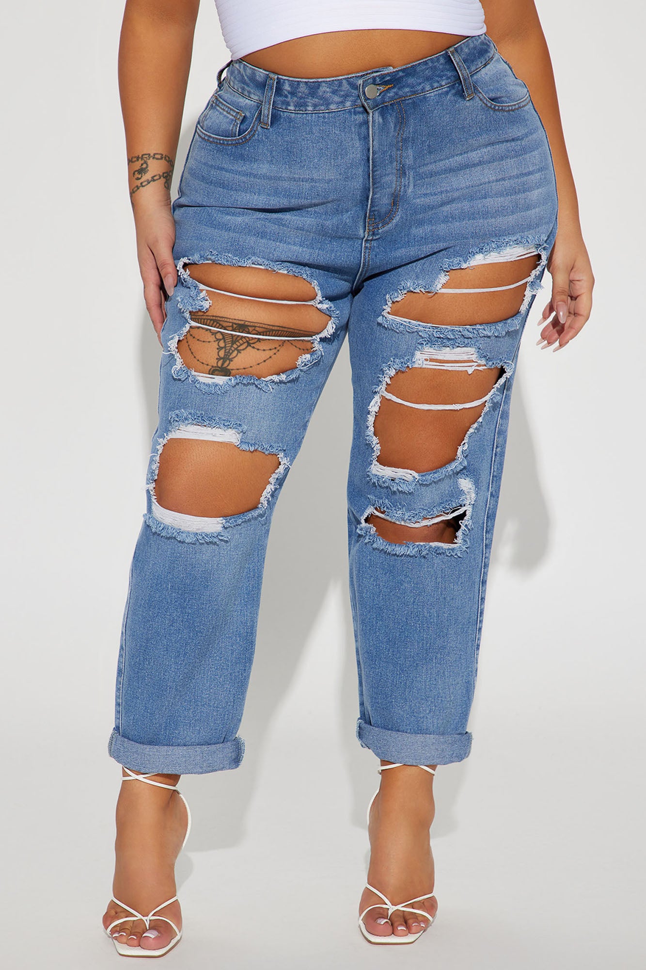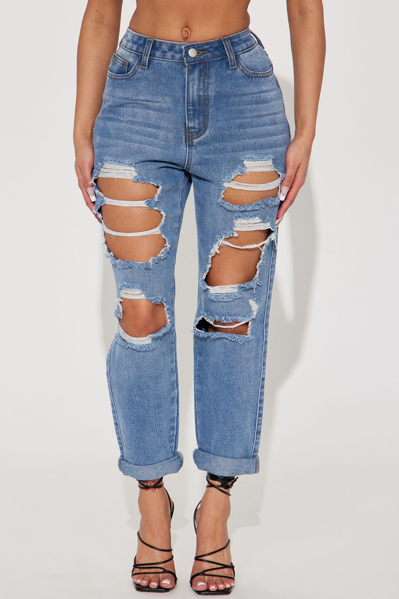 • Get A Clue Ripped Non Stretch Mom Jeans - Medium Wash