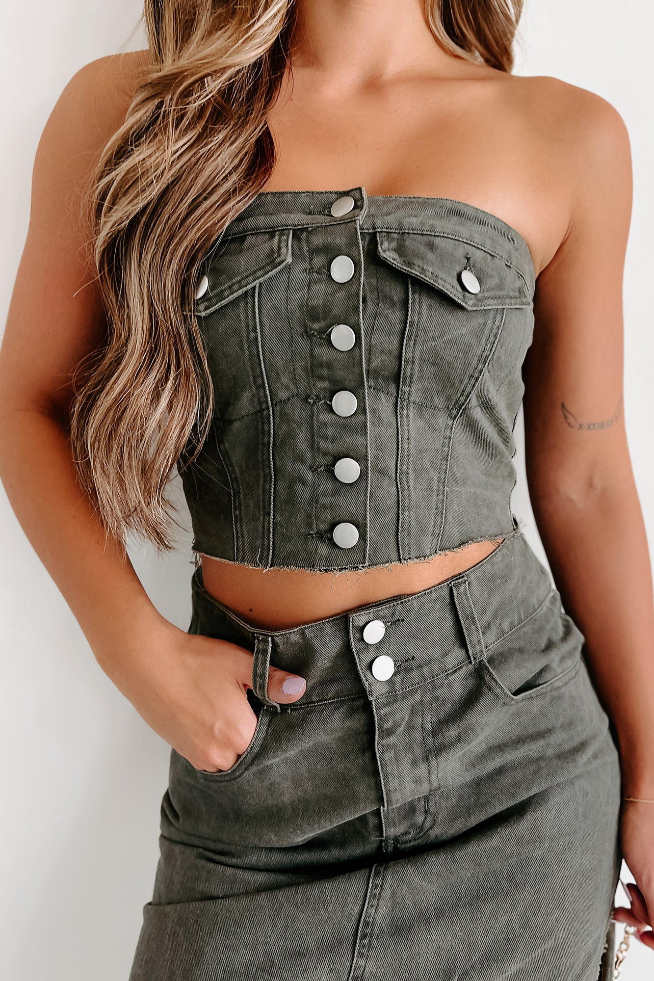 - Top: Strapless, Button-Up Front, Two Button Pockets, Smocked Back Detail, Raw Hem, Cropped Length