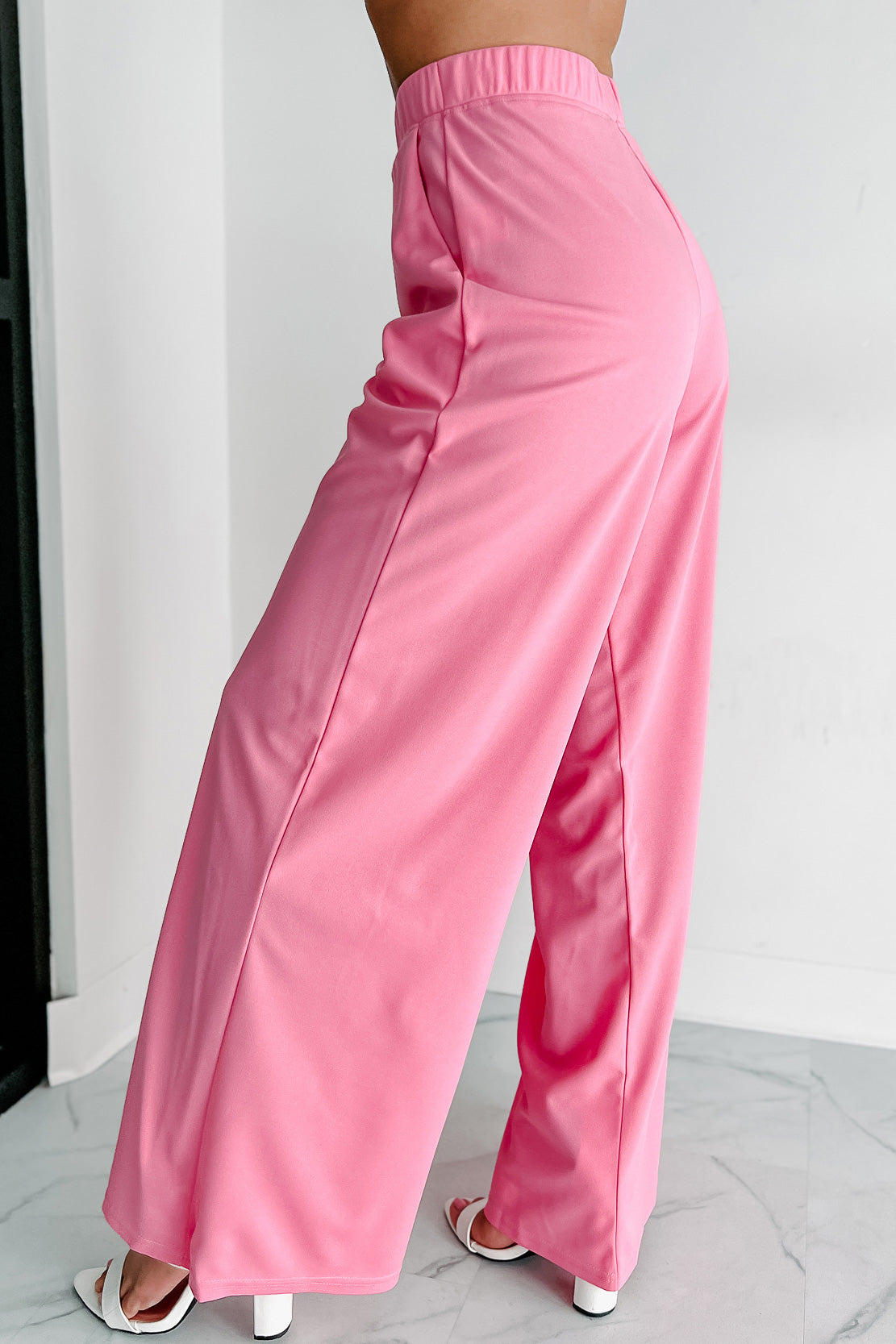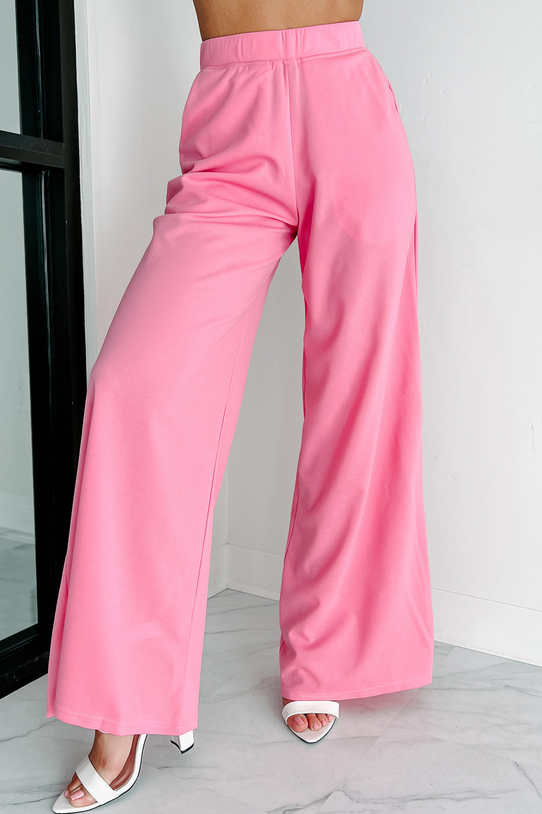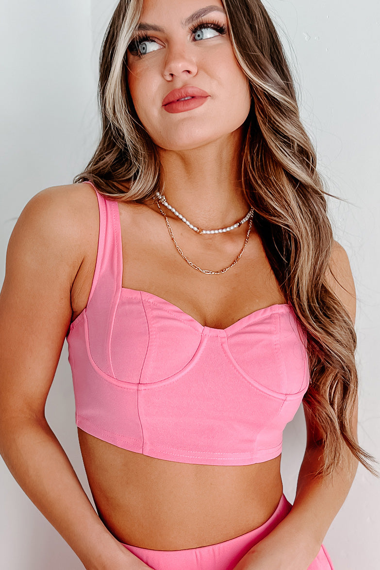 Flaunt your flattering figure in this fashion-forward set! This gorgeous pink ensemble features a cropped top with 1" wide straps, underwire support and zipper back closure. The comfy elastic waistband pants are designed to hug curves while providing pockets for all of life's essentials; the high rise fit gives you an extra boost as well making these wide legs unbeatable when it comes to flatteringly stylish outfits that won't break the bank.