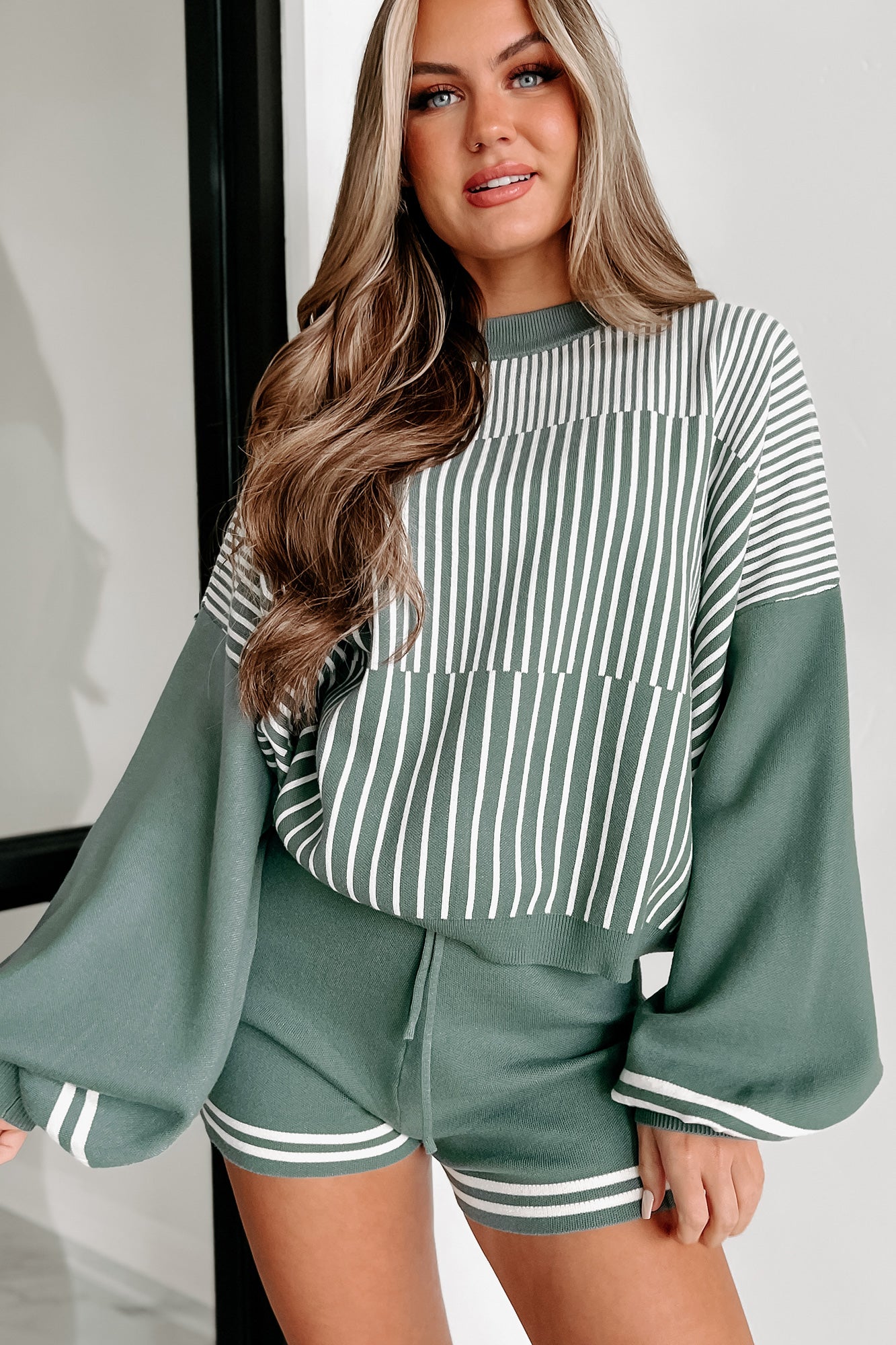 - Top: Contrasting Stripe Pattern, Oversized/Bubble Sleeves, Oversized Fit